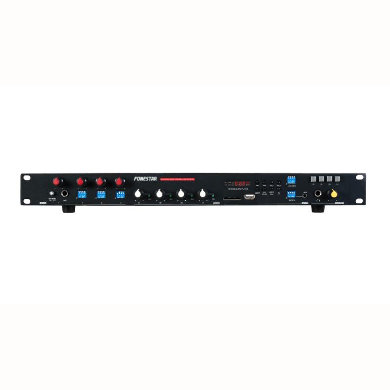 Mezclador/preamplificador con matriz de audio de 5 canales asignables a 4 zonas de salida con control independiente de volumen. Reproductor USB/SD con sintonizador digital de radio FM. Distribución de audio en instalaciones con varias zonas y diferentes programas musicales. Control remoto del volumen en cada zona.