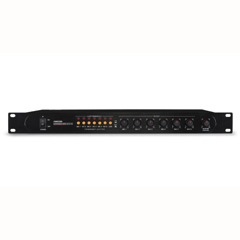 Mezclador para micrófonos/línea de 7 canales con supresor de realimentación acústica mediante desplazamiento de frecuencia. 6 entradas de micrófono y 1 de línea.